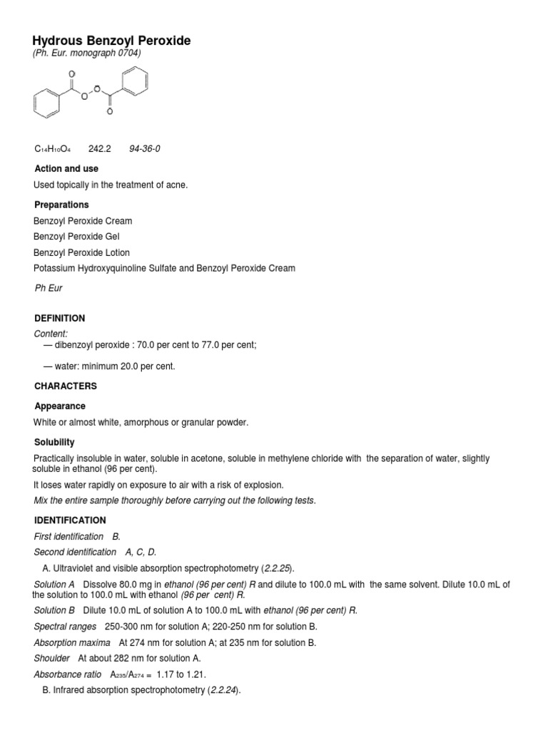 Hydrous benzoyl peroxide, 75 percent, usp is used to treat mild to moderate acne. Learn about the structure, properties, and uses of benzoyl peroxide here. Benzoyl peroxide or dibenzoyl peroxide. All spectrum chemical usp products are manufactured, packaged and stored under current good manufacturing practices (cgmp) per 21cfr part 211 in fda regist.