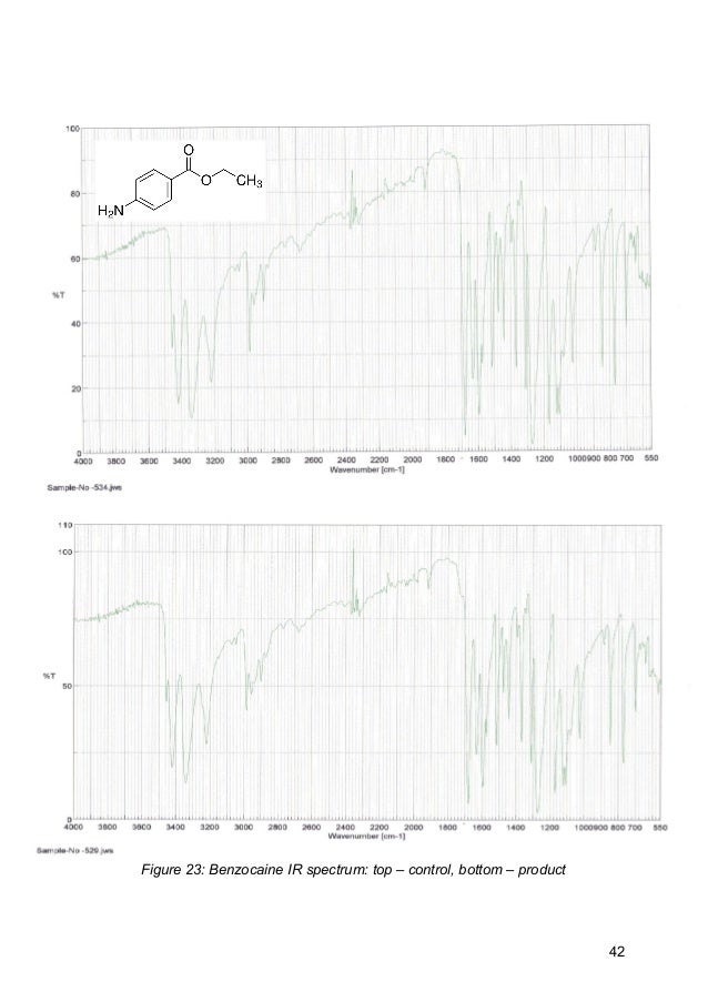 View Benzocaine Ir Spectrum Background. Severalimportant peaks in the ir spectrum of benzocaine (figure 3, supplemental data) were used toidentify the product as benzocaine. .ir bands in the spectrum above and identify corresponding bonds/functional groups in benzocaine molecule.